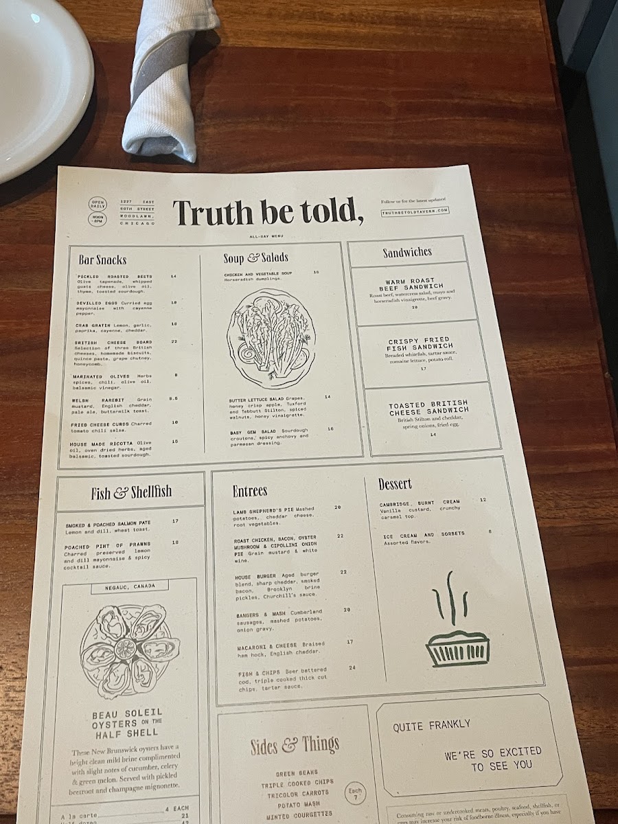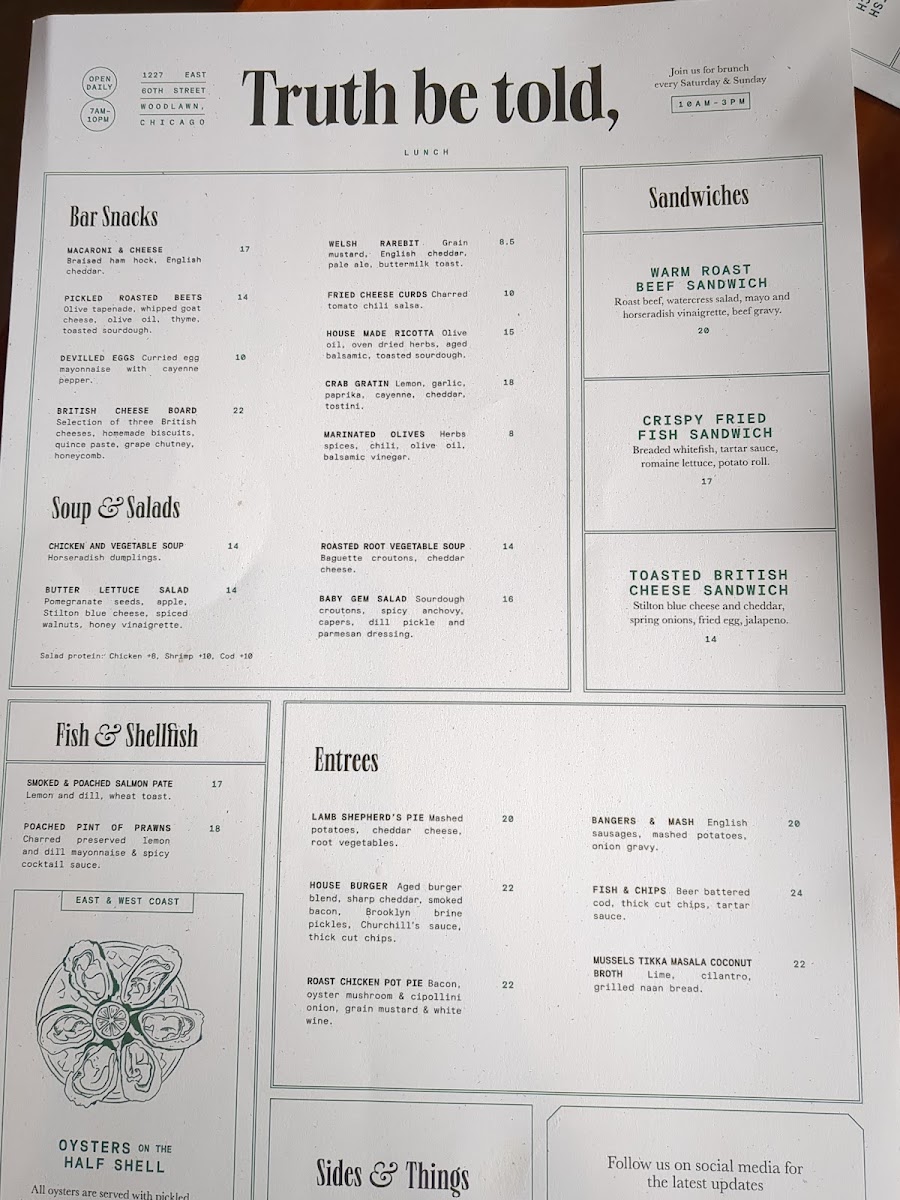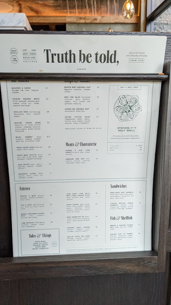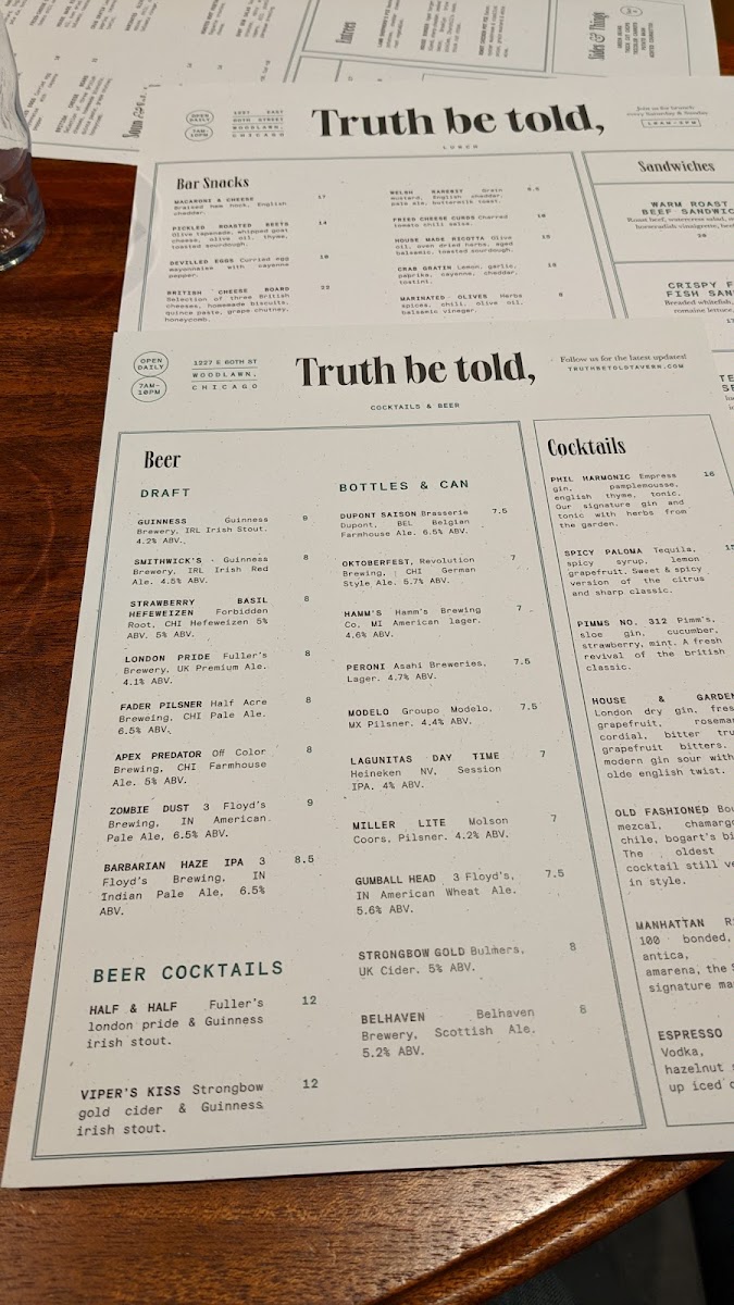 Welcome to Truth Be Told, a delightful culinary gem located at 1227 E 60th St, Chicago. This charming eatery offers a well-curated menu that showcases comfort food with a gourmet twist. Start your day with the Study Breakfast, featuring perfectly cooked eggs and hearty sides, or indulge in the trendy Avocado Toast. For lunch, the Warm Roast Beef Sandwich is a must-try, marrying robust flavors with fresh ingredients.